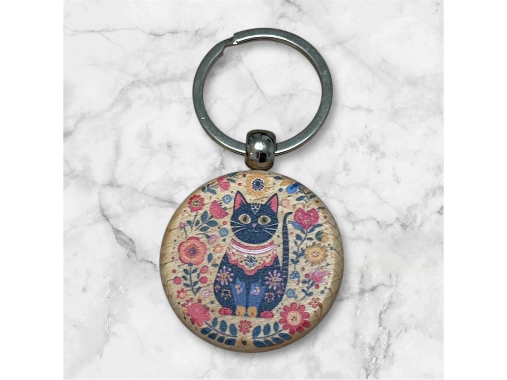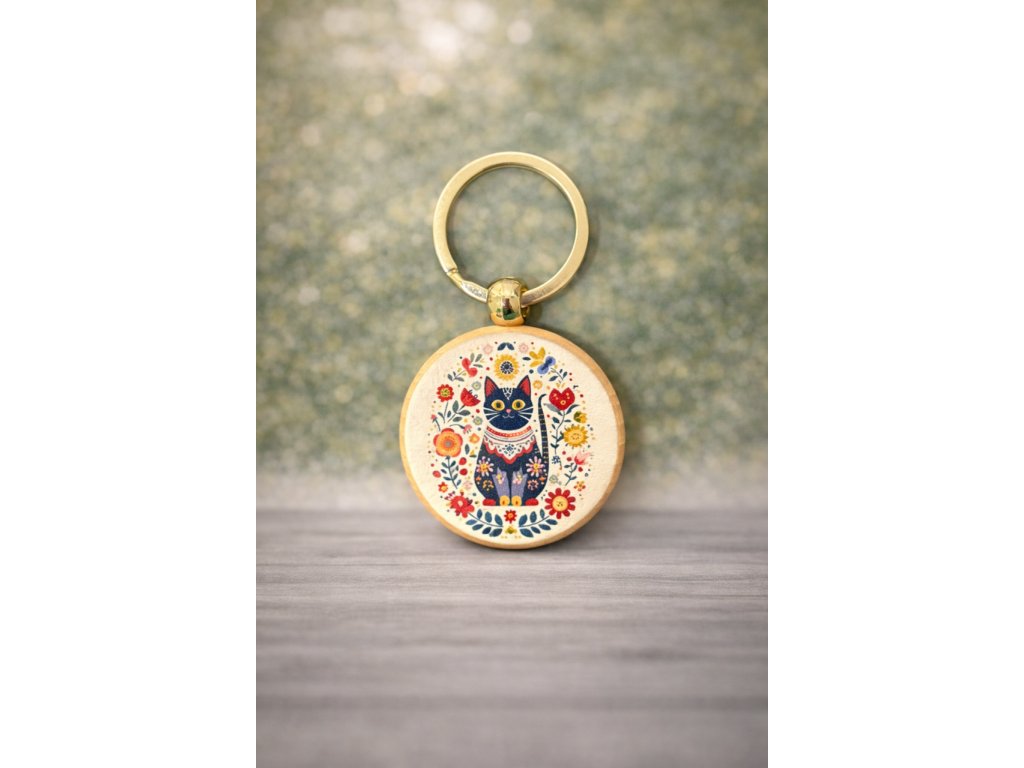 Krásná dřevěná klíčenka s folklorním motivem s kočičkou.
