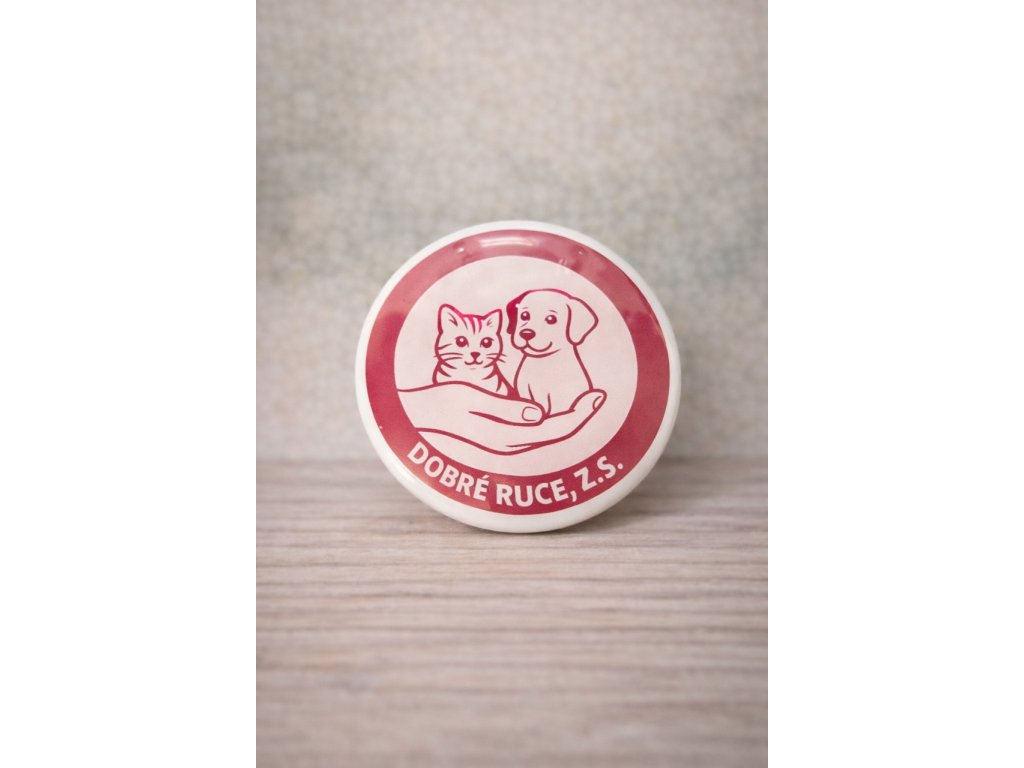 Kovová placka o průměru 6 cm s logem Dobré ruce, z.s. je jednoduchým způsobem, jak dát najevo podporu pomoci zvířatům v nouzi.