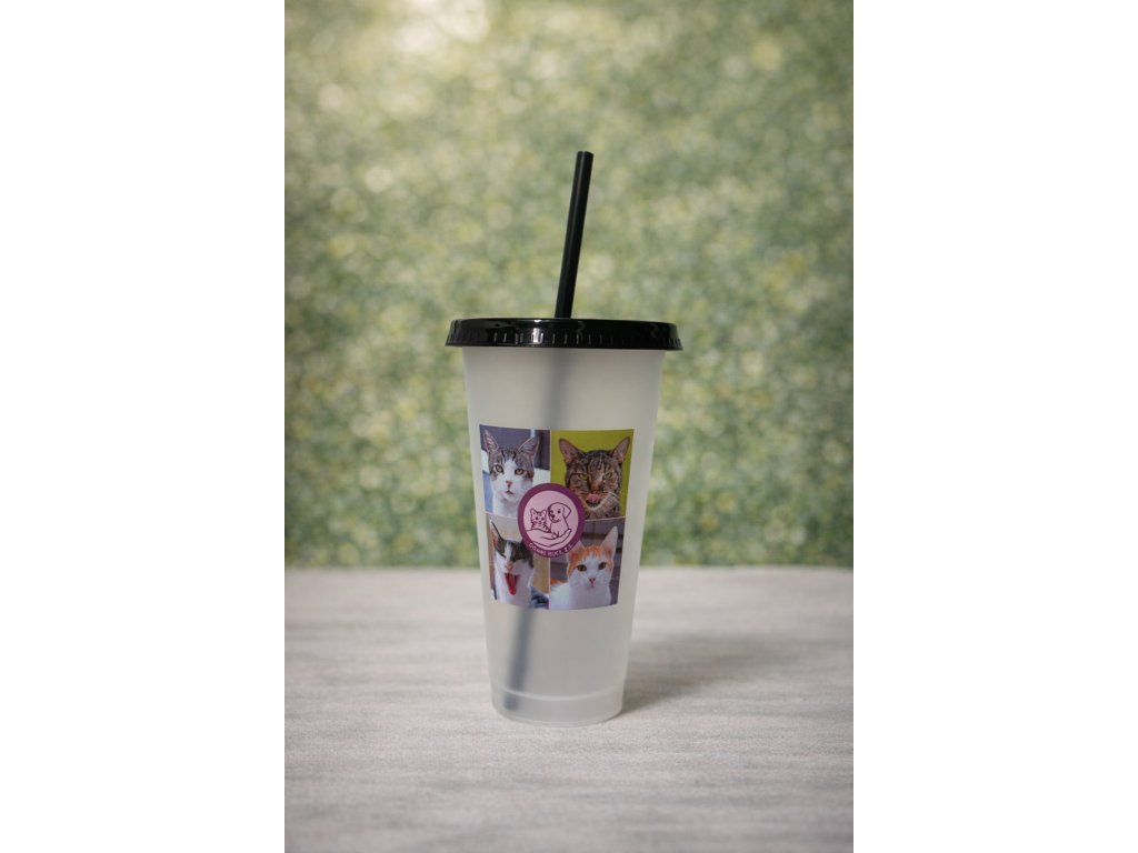 Lehký plastový kelímek s brčkem a fotografiemi koček, které jsme v našem útulku zachránili.