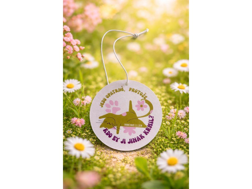 Jemný jarní design s kvítky a milým vzkazem dělá z tohoto kousku krásný doplněk do auta – nebo drobný dárek pro každého milovníka koček.